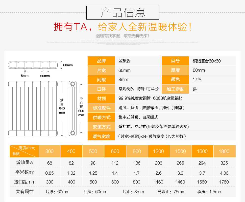 4、型号多样、外形美观:暖气片叱咤市场的一大助力就是它外形美观时尚,铜铝复合暖气片也不例外,市场上各种大小规格的型号都有,而且美观时尚,可以为家居增色添辉。
