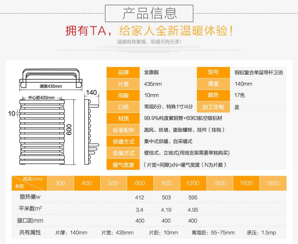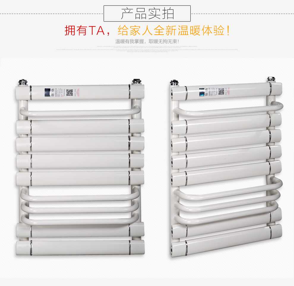 铜铝复合暖气片卫浴暖气片简约、时尚、美观、大方,既可以取暖,又可以作为毛巾架使用,是卫生间必备产品;其容水量大,水流量大;全辐射散热,比对流暖气片对水温要求低,反应灵敏,一旦启动,立即加热您的皮肤和空气;停暖后,仍能持续供暖,直至水温降至室温水平。